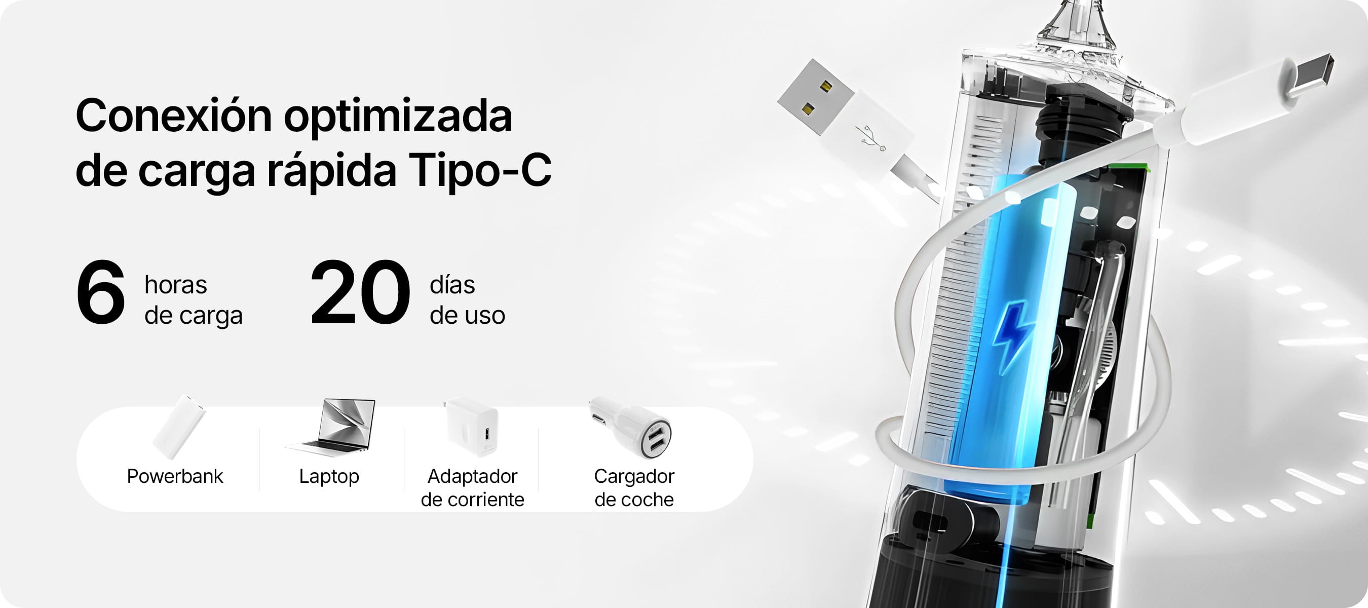 ✓ Batería de larga duración para una libertad total: Tras solo 6 horas de carga, utilice su irrigador dental hasta 20 días. Perfecto en casa, de vacaciones o de viaje. El cable USB Type-C incluido permite una recarga flexible a través de powerbank u ordenador portátil.